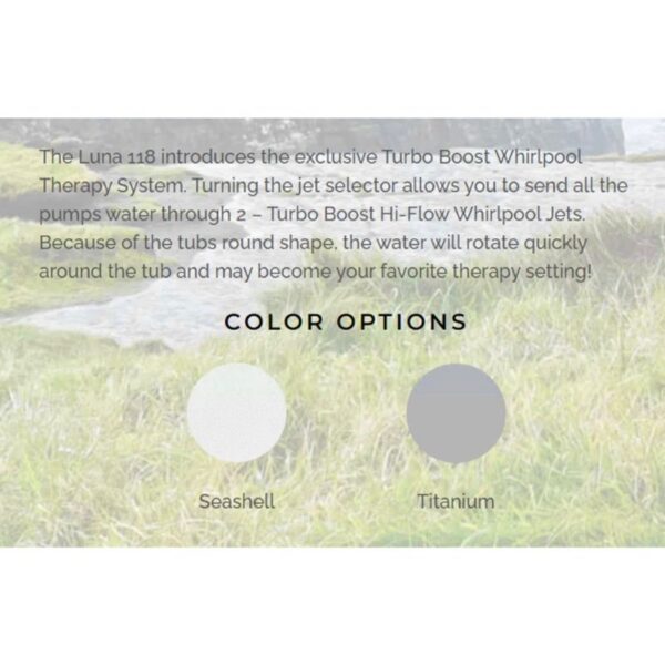The Luna 118 introduces the exclusive Turbo Boost Whirlpool Therapy System. Turning the jet selector allows you to send all the pumps water through 2 – Turbo Boost Hi-Flow Whirlpool Jets. Because of the tubs round shape, the water will rotate quickly around the tub and may become your favorite therapy setting!