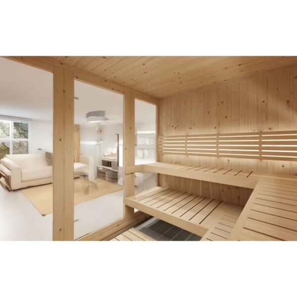 The spacious Therma 78 indoor sauna comfortably accommodates up to 6 bathers. This premium sauna kit offers a comfortable sauna experience with grade-A Thermo-Aspen benches and backrests. The clear tempered front door creates a sleek and inviting entrance to your sauna oasis, allowing natural light to illuminate the space and provide a sense of openness.