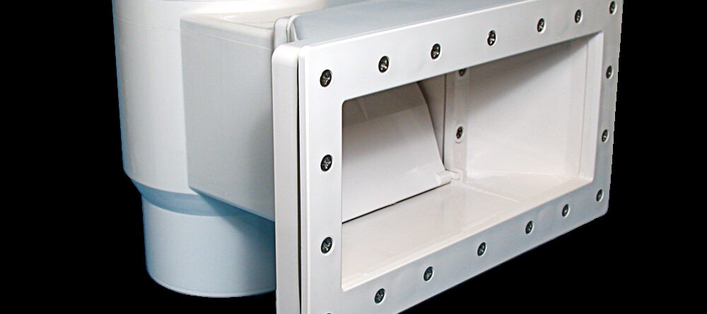 Wide Mouth Short Throat Above Ground Pool Skimmer with Two Return Fittings Permanently attaches to your above ground swimming pool, efficiently sweeping in debris from the surface of the pool water.